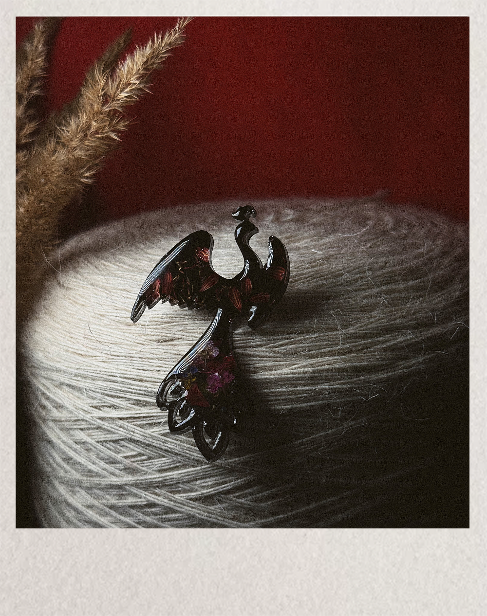 Украшение из ювелирной смолы с ручной вставкой полевых цветов, вдохновлённое наследием сибирской земли: тёмный фон символизирует плодородный чернозём Тюменской области, а яркие цветы как на тюменских коврах — счастье и процветание.